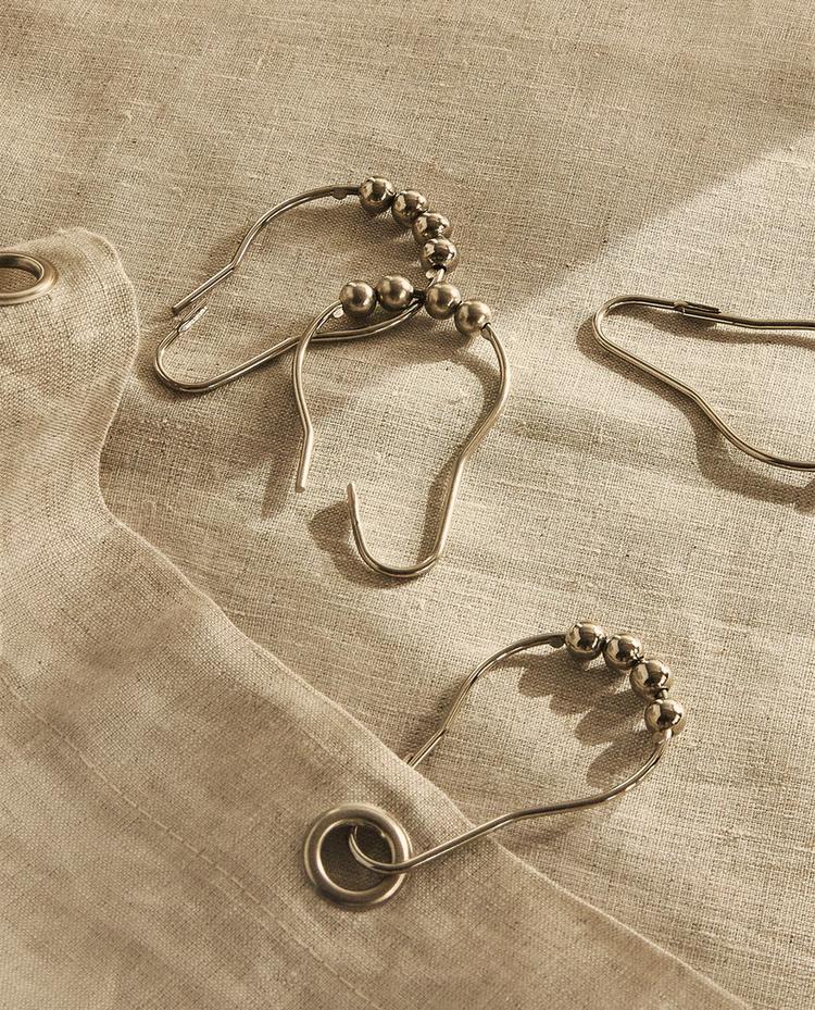 Metal shower curtain rings. They open on one side when pressed. Small metal balls allow the curtain to slide easily along the rod.