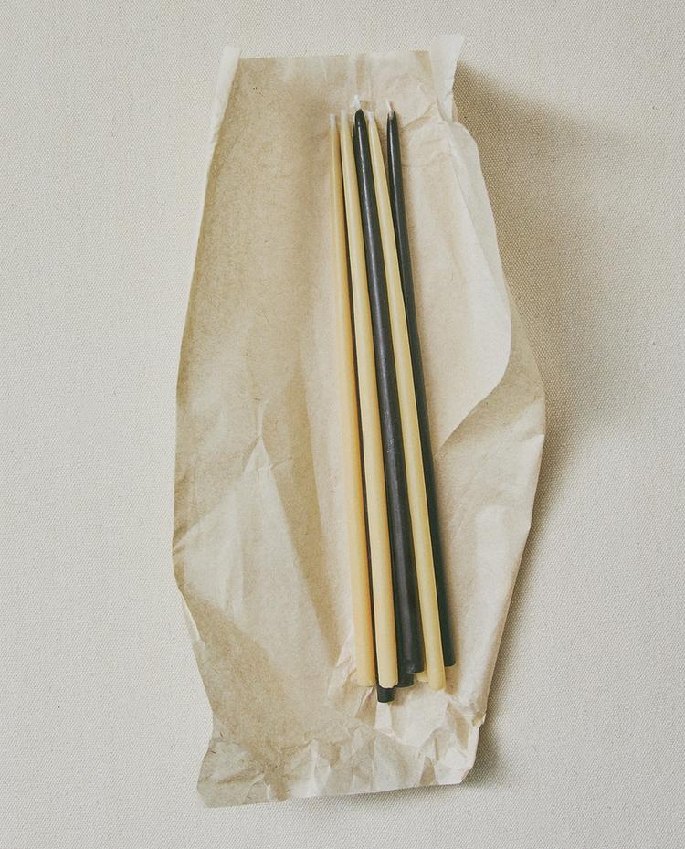 Set of 12 scented candles made of vegetable wax —six in each colour— and a candleholder with space for three candles. Comes in a wooden box.