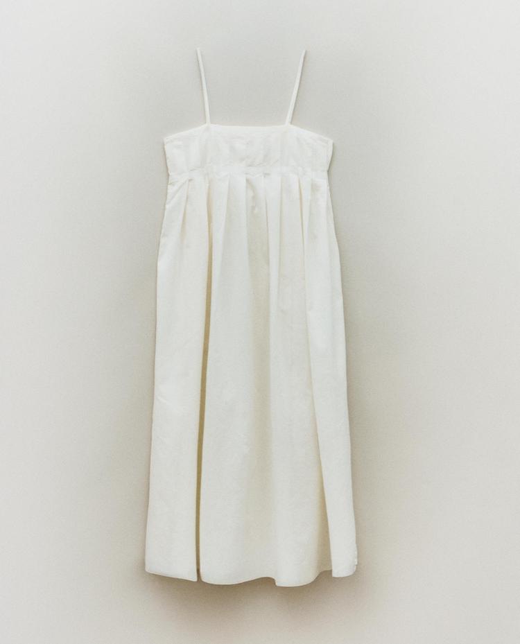 Lang natkjole i bomuld med tynde stropper og plisseringer på kroppen.