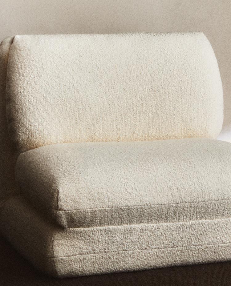 Lænestol med sammenfoldelig metalstruktur og aftageligt boucléstof med struktur og for at udfolde, påfør let tryk bagpå stolen.