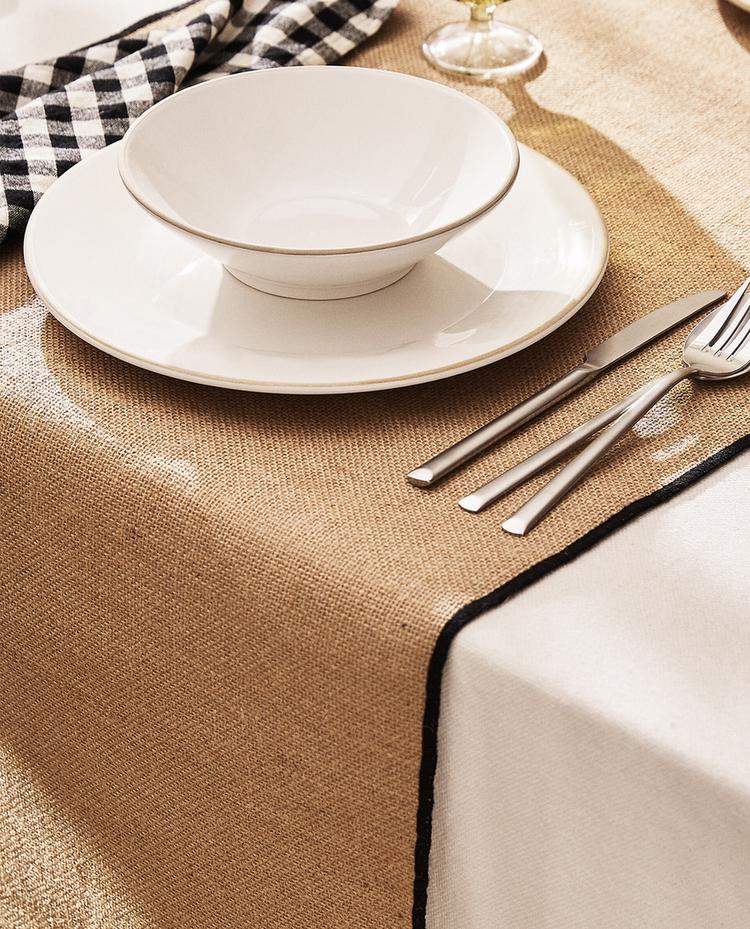 Chemin de table en jute avec bord contrastant.