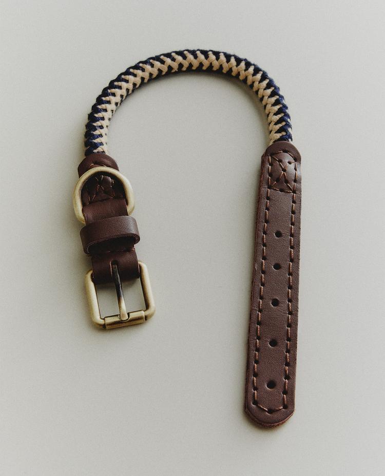 Pet collar with a two-tone rope design and leather strap fastening with a metal buckle. Available in two adjustable sizes: