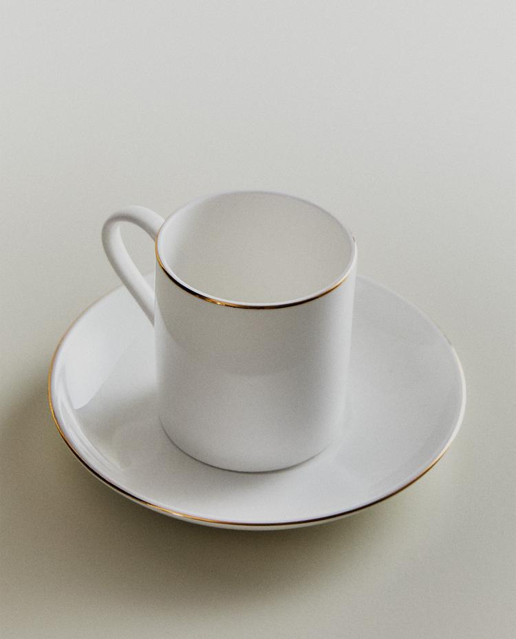 Bone china porcelain coffee cup and saucer. Decorated with a contrast rim.