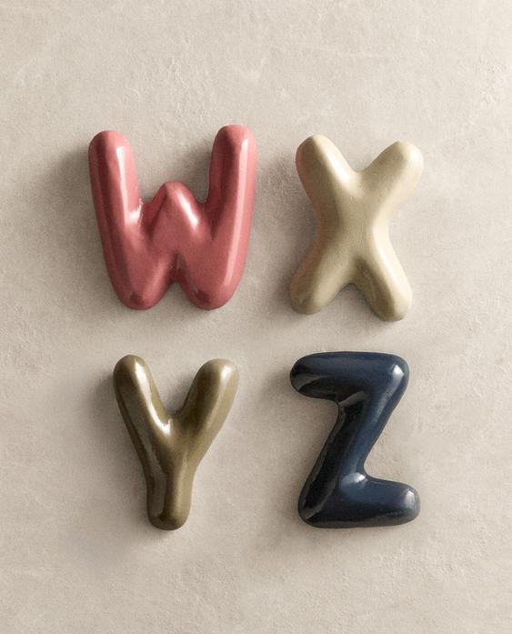 Adorno de pared hecho en papel, con forma de letra. Tiene un gancho para colgar en la parte trasera.