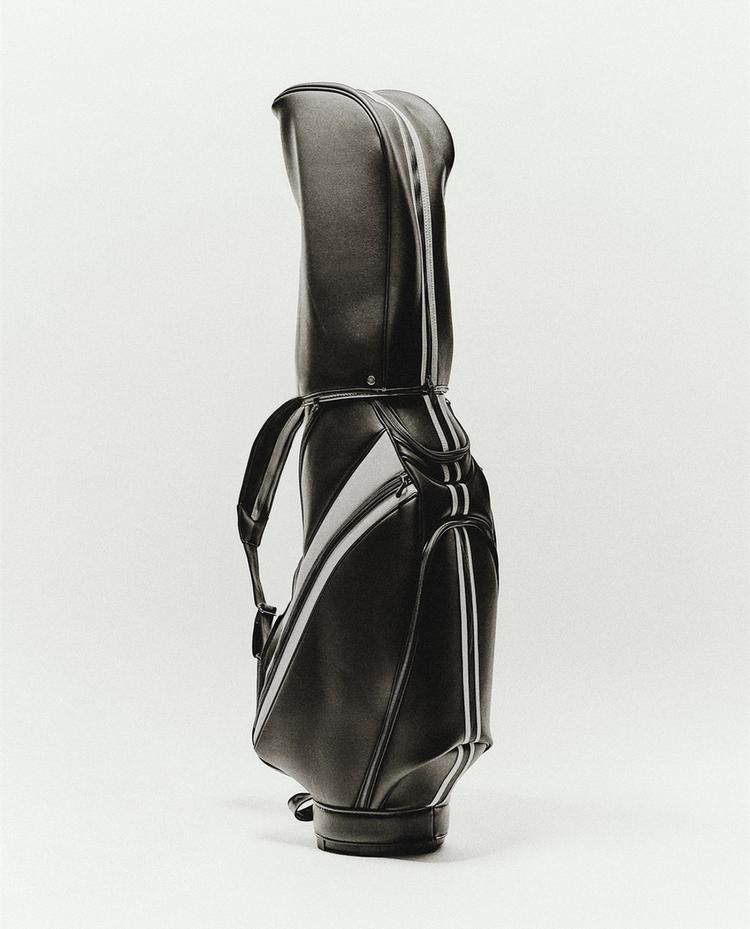 Bolsa de golf confeccionada principalmente en piel bovina. Diseño rígido y estructurado, con compartimentos interiores para palos, múltiples bolsillos exteriores con cierre de cremallera, parte superior extraíble y asa lateral para transporte. Detalle de bandas verticales en contraste de color.