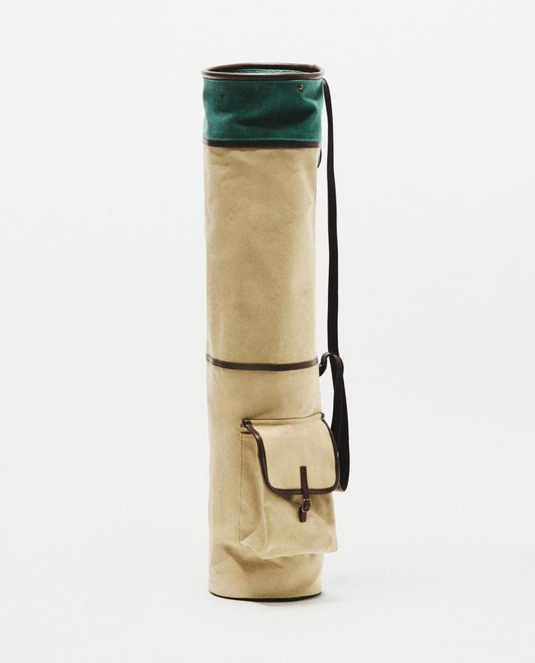 Bolsa de golf confeccionada principalmente en algodón y piel bovina. Diseño ligero y estructurado, con compartimento principal para palos, bolsillo exterior con solapa y cierre mediante hebilla, y asa lateral con correa para transporte. Detalle de acabados en contraste de color.