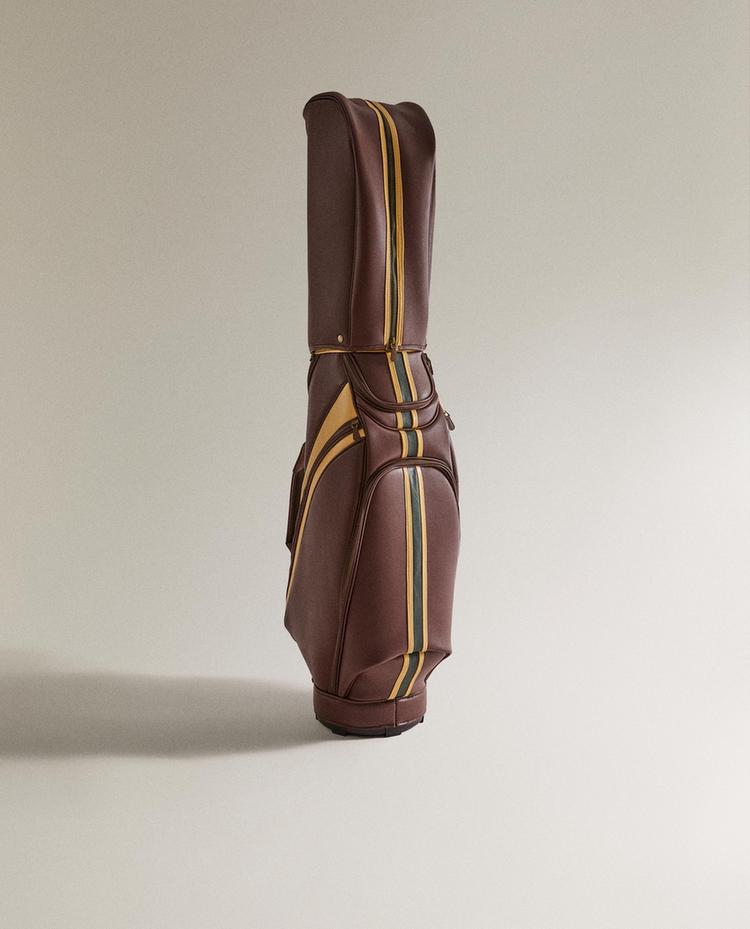 Bolsa de golf confeccionada principalmente en piel bovina. Diseño rígido y estructurado, con compartimentos interiores para palos, múltiples bolsillos exteriores con cierre de cremallera, parte superior extraíble y asa lateral para transporte. Detalle de bandas verticales en contraste de color.