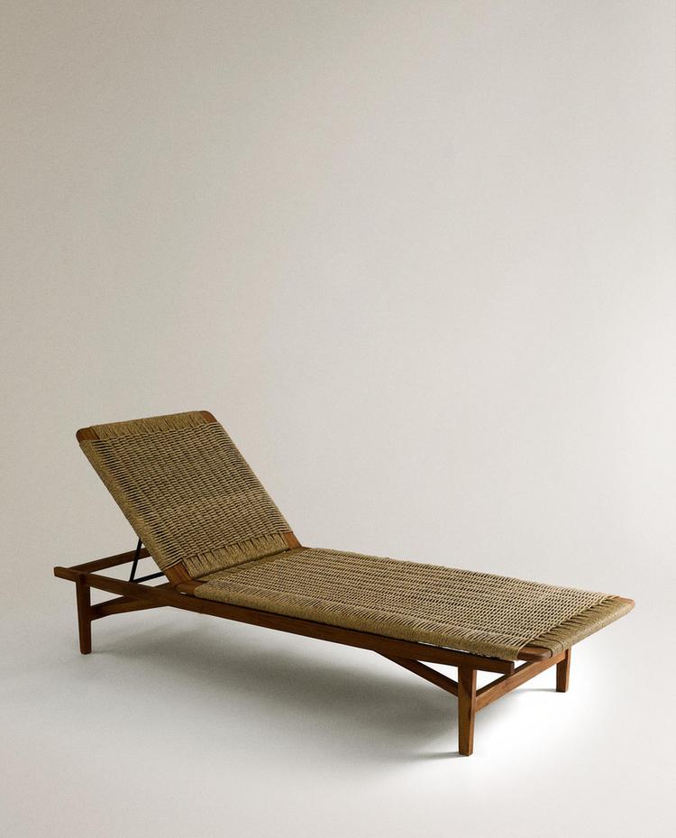 Gandula apta per a exteriors amb estructura de fusta de teca i superfície trenada feta de fibres sintètiques, cosa que permet netejar-la amb facilitat. El respatller és reclinable en quatre posicions.