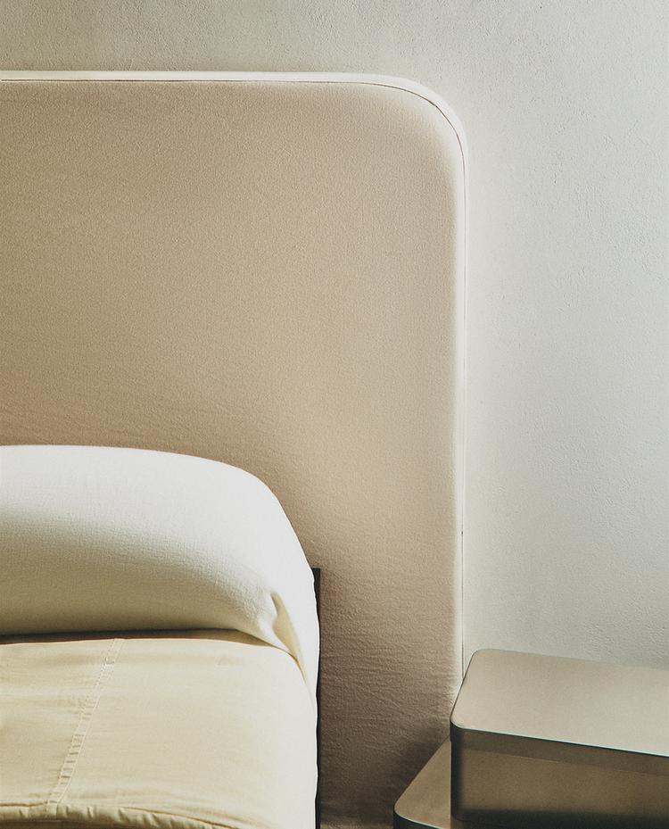Cabecero de madera de pino redondeado con funda de lino desenfundable y lavable.