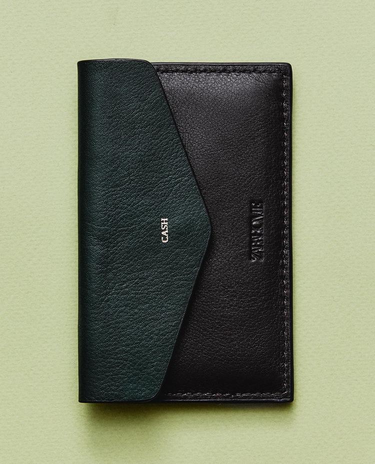 Cartera confeccionada en piel con cierre mediante botón a presión. Diseño compacto con solapa grabada “Cash”, compartimento interior identificado como “Cards” para tarjetas y ranura posterior para billetes.