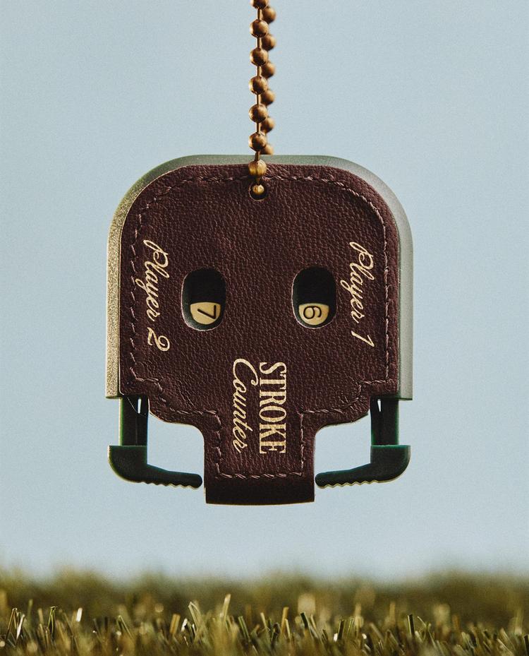 Contador de golpes de golf. Diseño liso a contraste con funda elaborada en piel ovina a contraste de color. Incluye marcadores numéricos para dos jugadores, anilla con cadena para sujeción y detalle de texto en contraste.