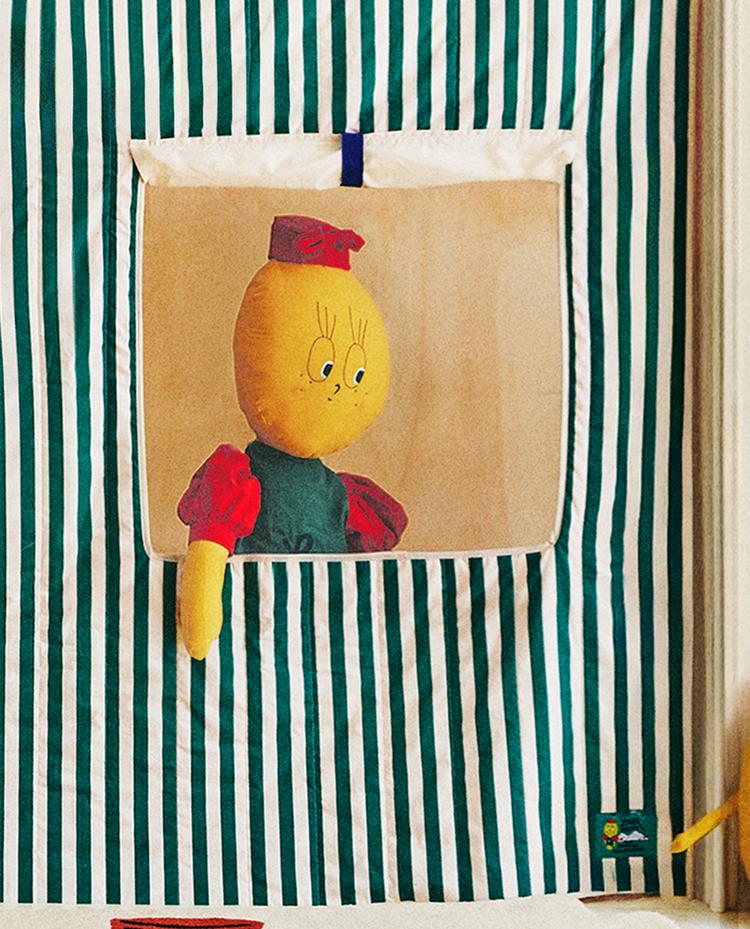 Cortina infantil confeccionada en algodón con diseño de rayas multicolores y ventanas con solapas enrollables x The Animals Observatory.
