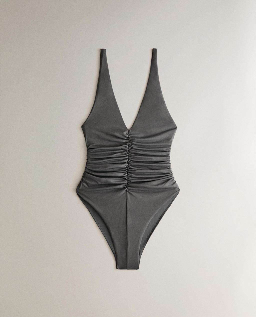 Hondartzarako bainujantzi lisoa, v-formako eskotearekin, tira zabalekin eta aurrealdean eta atzealdean xehetasun bildurtuarekin.