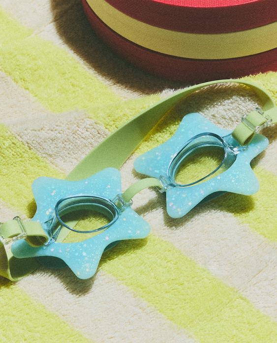 Hondartzarako urpekaritza-betaurrekoak, haurrentzako, polikarbonatozko lenteekin, ur azpian ikuspen argia errazteko, izar-diseinuarekin eta silikonazko uhal doigarri elastikoarekin.