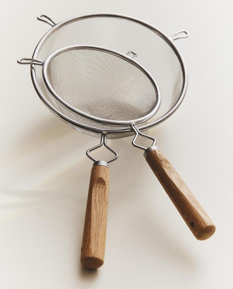 Metalezko iragazkia, altzairuzko sare finekoa eta haritzezko kirtenekoa, forma zirkularrekoa eta alboko euskarriarekin.