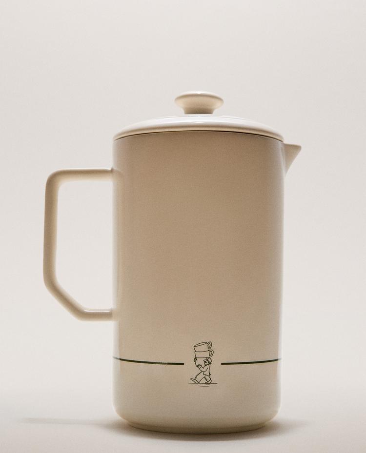 Grezko prentsa-kafetera, "french press" estilokoa, kafean inspiratutako diseinu ilustratuarekin, lerro finekin definitua.