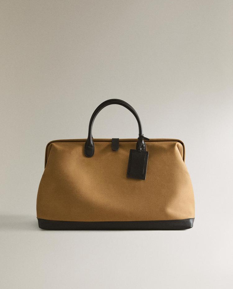 Bolsa de viaxe confeccionada en algodón con detalles en pel, peche mediante botón, asa curta e peto interior con cremalleira. Inclúe etiqueta identificativa de pel para personalizar.