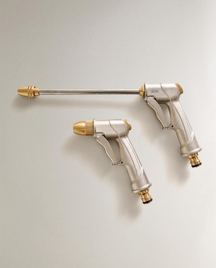 Pistola de regadío fabricada en aluminio e cobre. Incorpora boquilla regulable con 4 posicións de pulverización para adaptar o fluxo de auga segundo o uso.