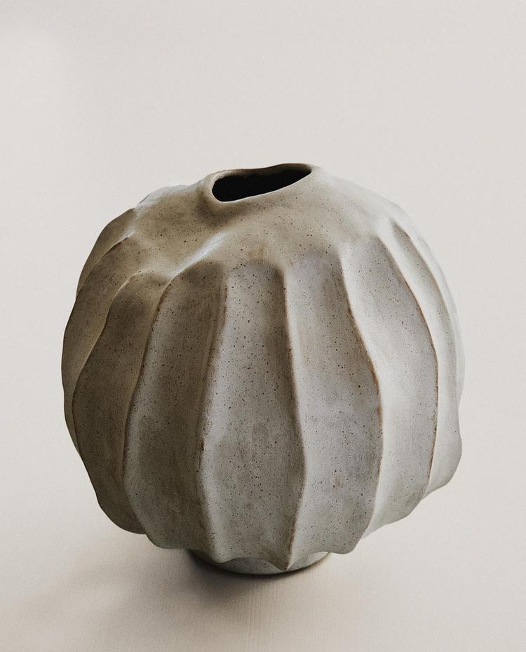 Jarrón florero de cerámica con forma redonda y volumen compacto, con apertura estrecha en la parte superior que permite colocar flores o ramas de tallo fino. Presenta superficie con relieve vertical acanalado. Puede contener agua.