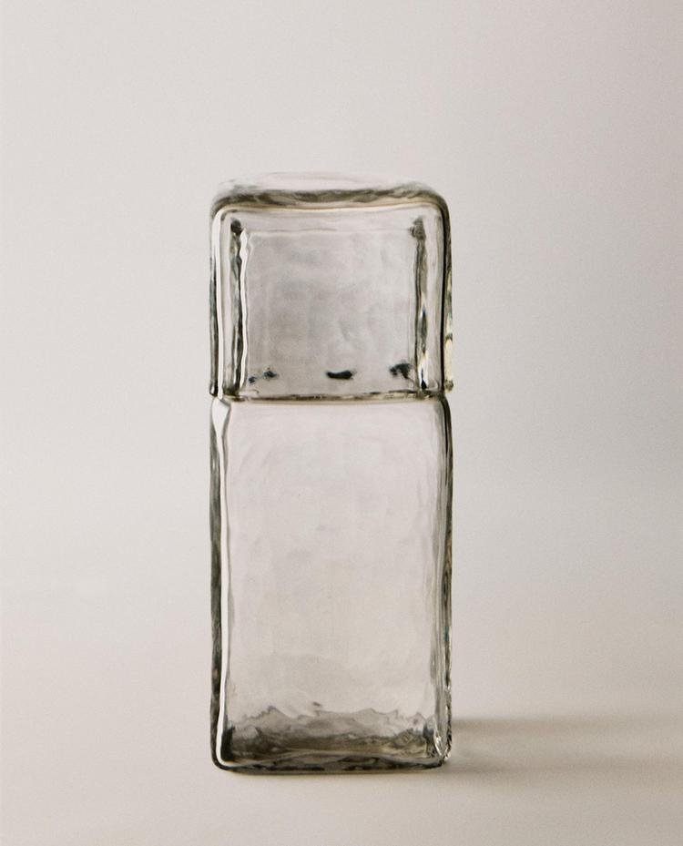 Juego de noche de vidrio transparente que consta de una botella y un vaso que encaja en la parte superior a modo de tapa. Tiene un diseño geométrico con formas rectas y acabado texturizado.