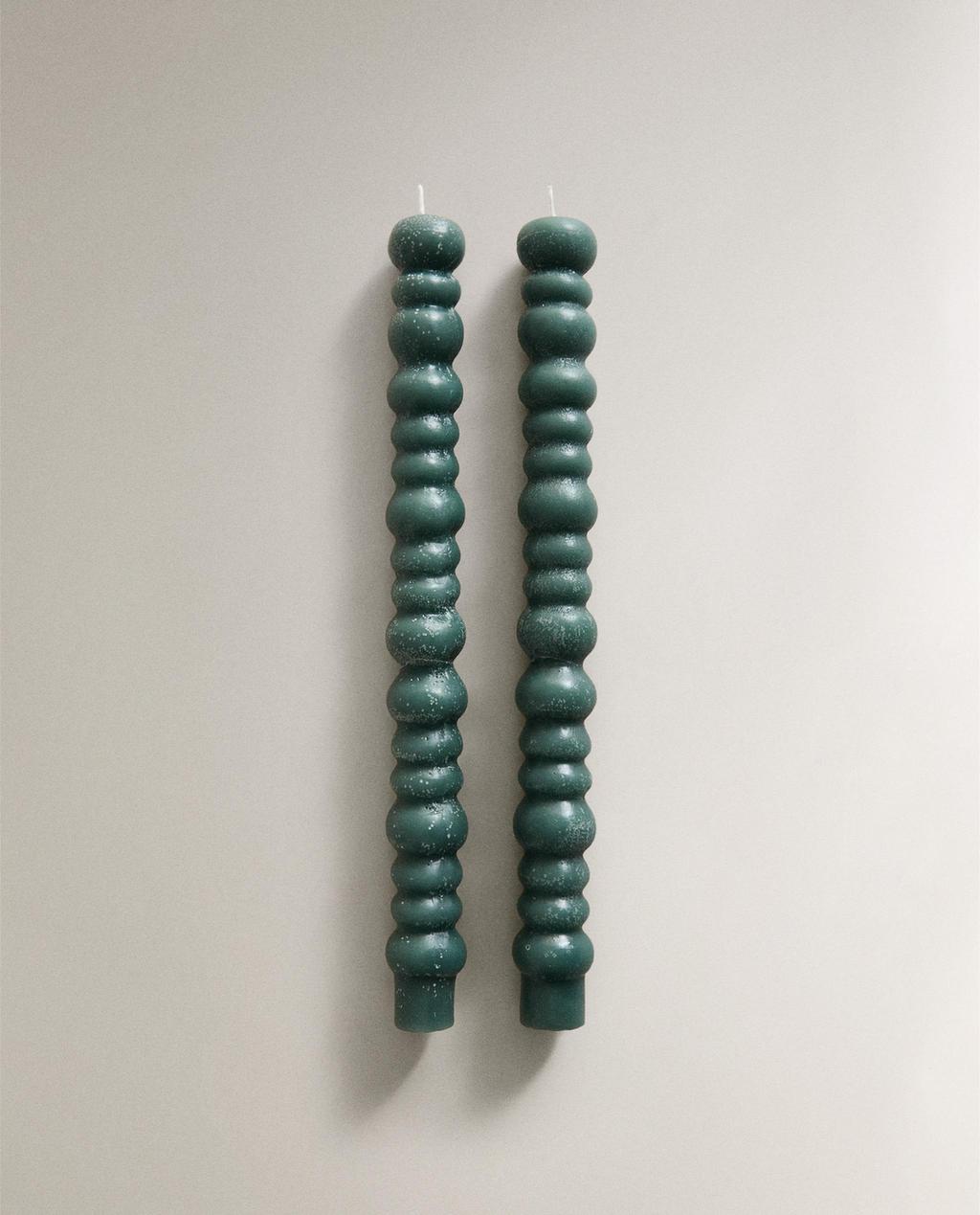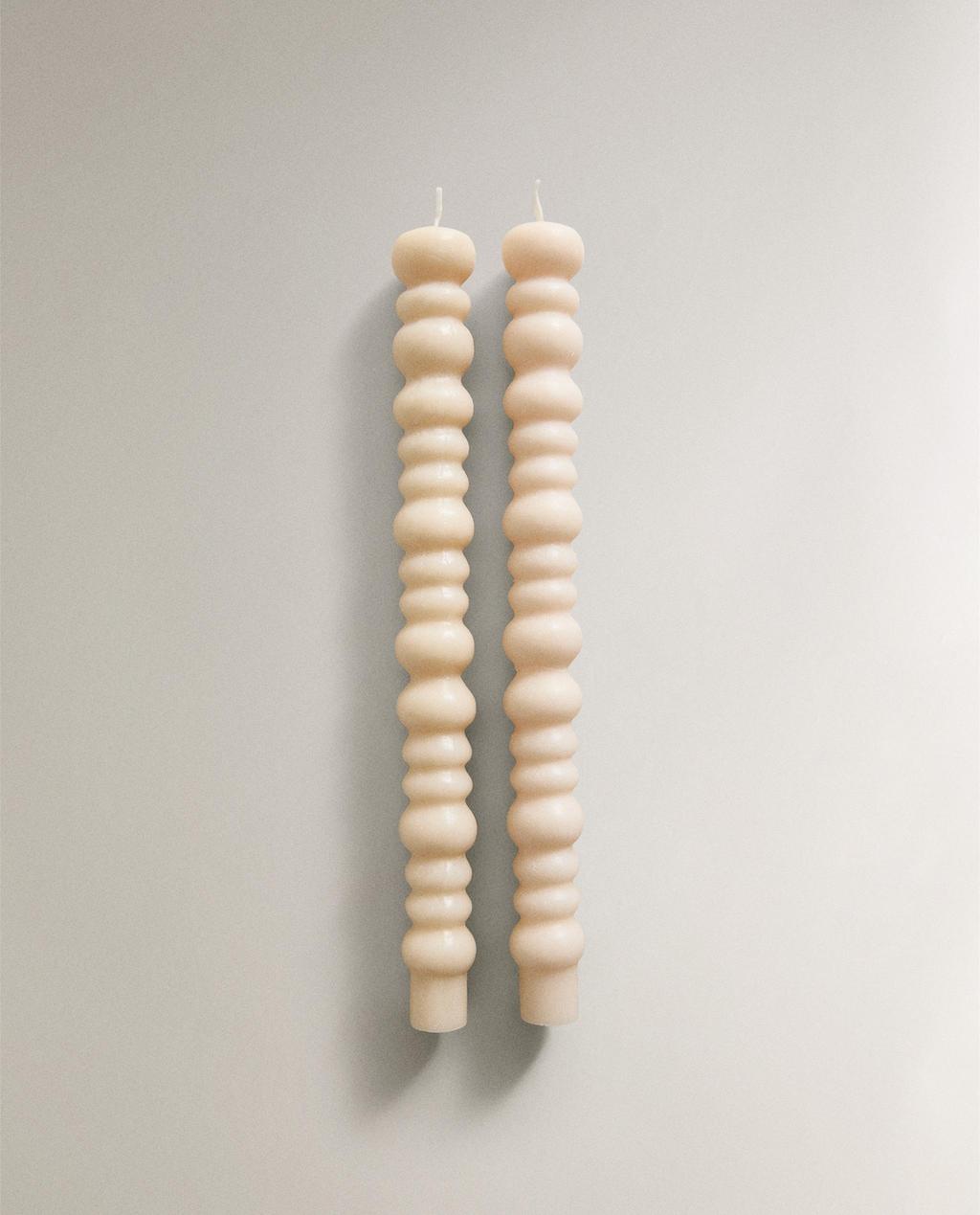 Velas decorativas en cera con diseño alargado y forma ondulada, diámetro de 2,2 cm y superficie texturizada en relieve continuo. Presentan base recta para apoyo estable y mecha central visible. El pack incluye 2 velas.