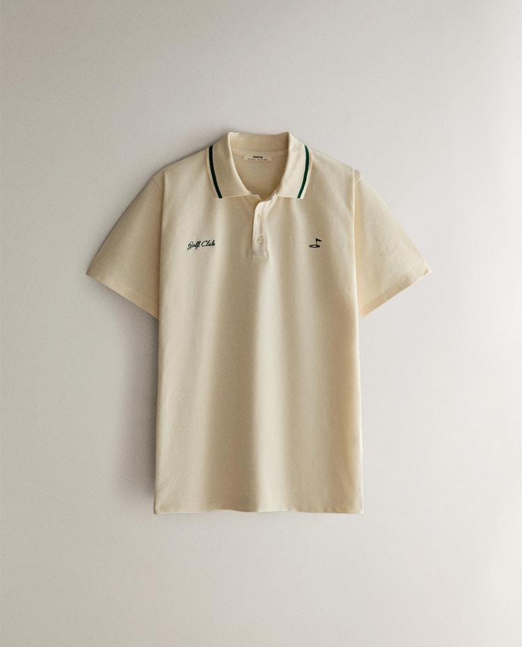 Polo de manga corta confeccionado en algodón. Cuello con solapas y cierre de botones. Diseño liso con detalle de línea a contraste de color en el cuello y bordados en el pecho con motivos de golf.