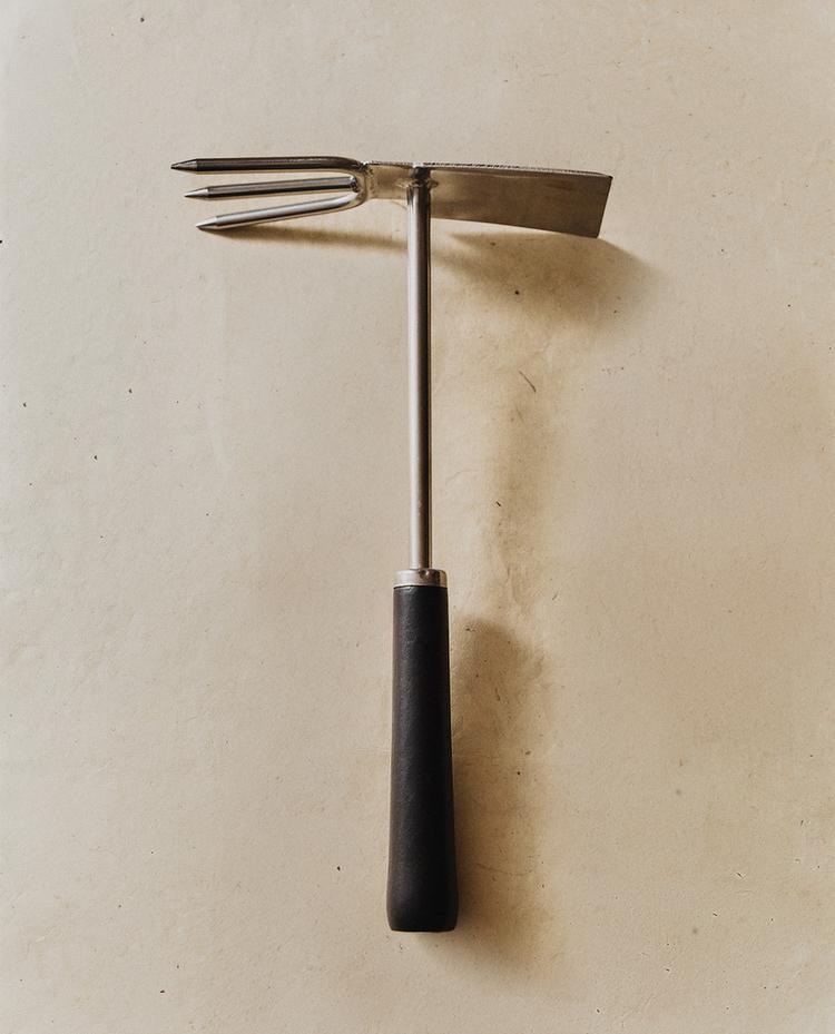 Rastrillo de mano de jardín elaborado en acero con mango de madera de haya. Tiene un cabezal compacto que combina una pequeña pala plana y tres púas largas, rectas y puntiagudas.
