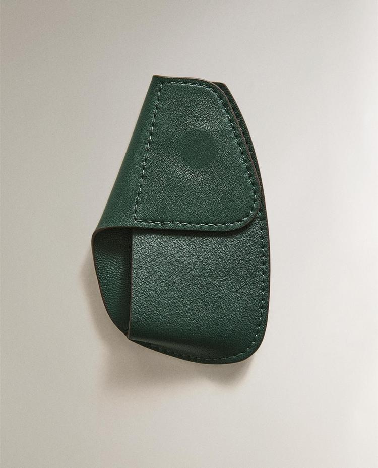 Estuche para bolas y tees de golf confeccionado principalmente en piel bovina. Diseño compacto con cierre superior mediante cremallera, interior forrado, soporte para tees en la parte exterior y mosquetón lateral para sujeción. Detalle de panel perforado y acabados en contraste.
