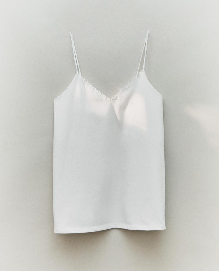 Top confeccionado en tejido fluido con tirantes finos y escote en pico con detalle de puntilla.
