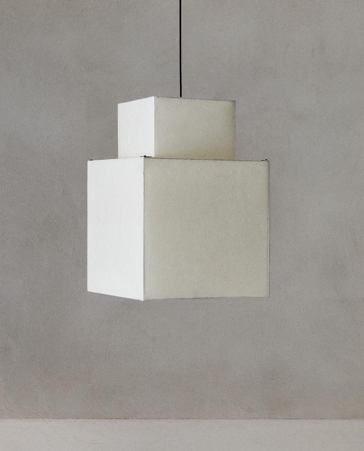 Lámpara de techo elaborada en papel. La textura delicada del papel, translúcida y cálida, filtra la luz suavemente, creando un espacio envolvente. La fuente de luz interior realza el volumen de la pieza. Su estructura en hierro se aligera con el uso del papel en el exterior.