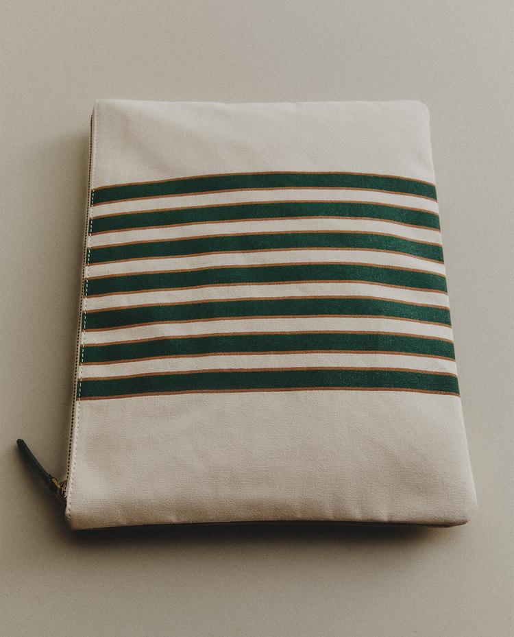 Lightweight travel bag with zip closure in a contrast striped design. Large format, designed for organising and carrying personal garments or objects.