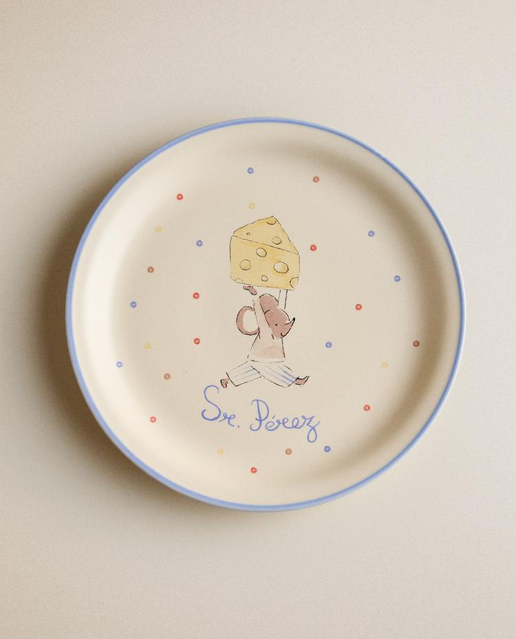 Assiette pour enfant en céramique. Avec bord de couleur contrastante et motif de la petite souris avec un fromage et le texte "M. Pérez".