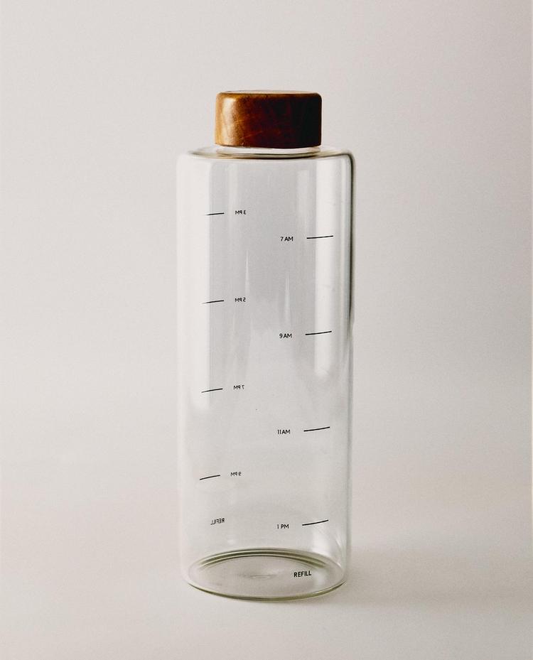 Bouteille rechargeable en borosilicate avec bouchon à vis en bois de chêne. Présente une graduation pour rappeler la quantité d’eau qu’il est recommandé de boire au quotidien, pour rester hydraté à tout moment.