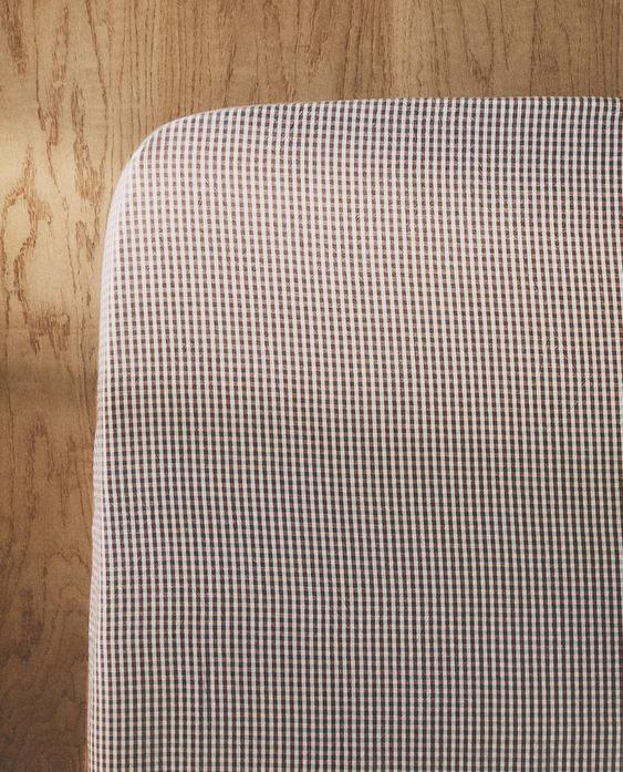 Drap-housse en fil teint avec motif petits carreaux contrastés de différentes couleurs.