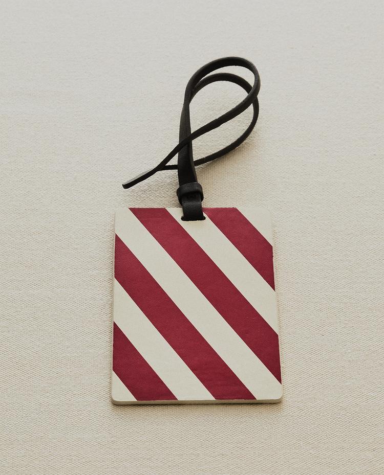 Étiquette de bagage en cuir avec cordon réglable pour une fixation facile aux valises ou sacs de voyage. Design à rayures diagonales.