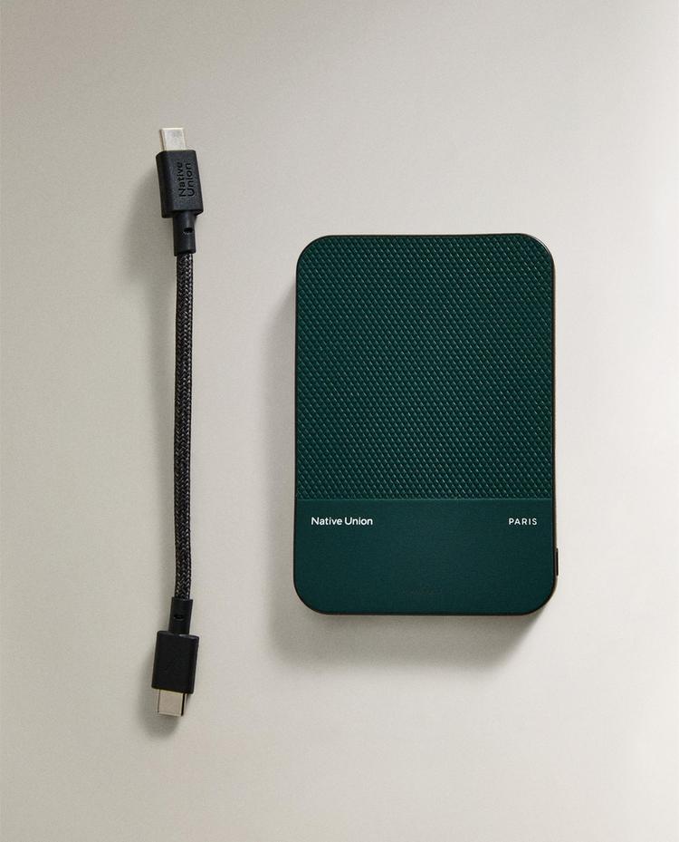 Portefeuille organiseur de voyage en cuir avec fermeture à bouton-pression. Il dispose de deux compartiments pour documents et billets, avec détails intérieurs sérigraphiés « Boarding Pass » et « Charge Plug », et d’une fente supérieure pour maintenir ou passer le câble de charge.
