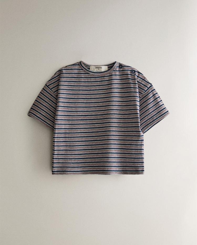 T-shirt enfant à manches courtes en coton et lin à rayures horizontales, avec des boutons sur l'épaule gauche.