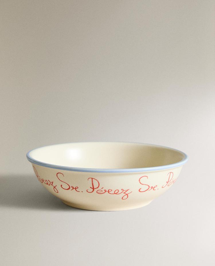 Tasse pour enfant avec anse en céramique. Avec un bord de couleur contrastante et un motif de la petite souris avec un fromage et le texte 'Sr. Pérez'.