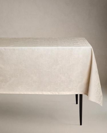Cotton jacquard tablecloth with floral motifs and a resin finish.