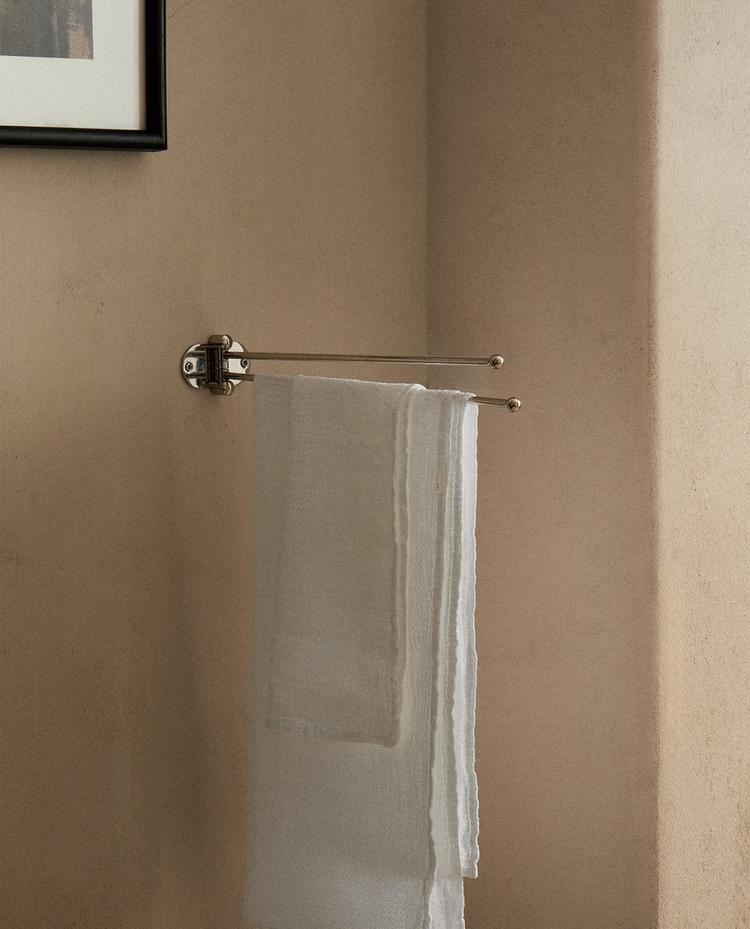 Διπλή κρεμάστρα πετσέτας μπάνιου τοίχου από μέταλλο με γυαλιστερό ασημί φινίρισμα και κινούμενα μπράτσα. Περιλαμβάνει υλικά στερέωσης.
