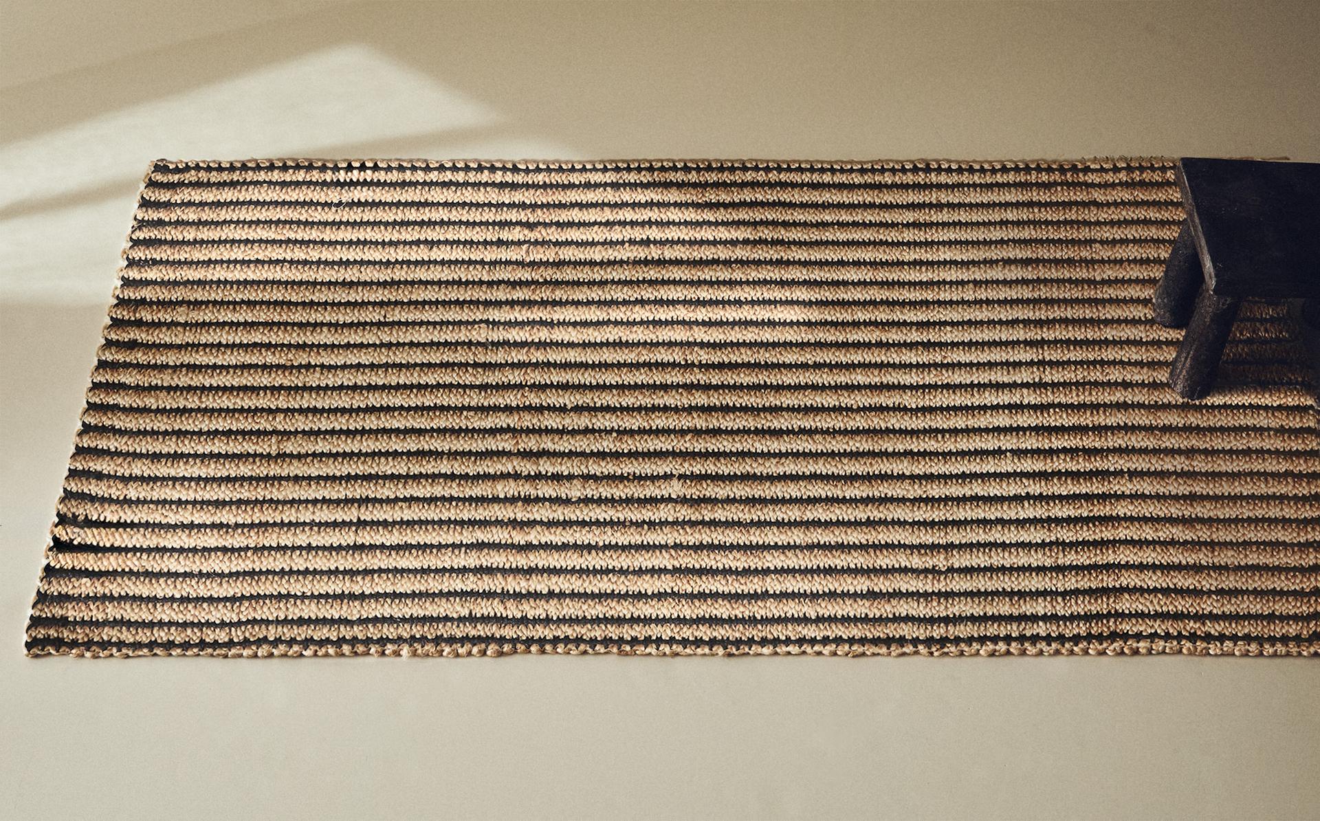 Ως πρωταγωνιστικό υλικό αυτής της συλλογής, η γιούτα είναι γνωστή για την αντοχή και τον οικολογικό της χαρακτήρα. Οι πλεκτές ίνες της προσφέρουν μια χειροποίητη και ζεστή πινελιά που ενσωματώνεται ιδανικά σε διαφορετικά διακοσμητικά στυλ.Επιπλέον, το ουδέτερο χρώμα και το σχέδιο του, όπως οι ρίγες, διευκολύνουν την ενσωμάτωσή του σε διαφορετικούς χώρους.