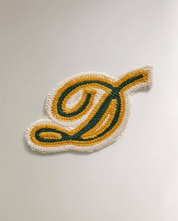 Θερμοκολλητικό μπάλωμα από βαμβάκι. Σχέδιο γράμματος D με κεντημένη καλλιγραφική γραμματοσειρά σε χρωματική αντίθεση και τελείωμα με ρέλι.