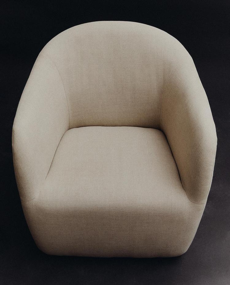 Πολυθρόνα με μπράτσα, ταπετσαρισμένη με λινό ύφασμα και ξύλινα πόδια.