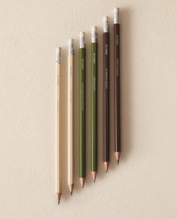 Μολύβια γραφείου με γόμα στο πάνω μέρος και σχέδιο εμπνευσμένο από καφέ και matcha. Το σετ περιλαμβάνει 6 τεμάχια σε τρία χρώματα, δύο από κάθε απόχρωση.