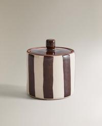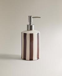 Dispenser μπάνιου από εφυαλωμένο κεραμικό με κυλινδρικό σώμα διακοσμημένο με κάθετες ρίγες σε καφέ και κρεμ τόνους. Διαθέτει μεταλλικό dispenser με γυαλιστερό φινίρισμα και λεία επιφάνεια.
