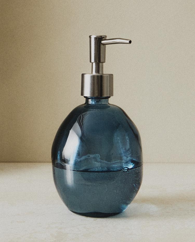 Dispenser μπανιου από ημιδιαφανές γυαλί σε μπλε απόχρωση, στρογγυλεμένο σώμα με σταθερή βάση και επάνω dispenser με ασημί φινίρισμα και επιμήκη αντλία.