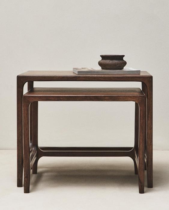 Βοηθητικά τραπέζια από ξύλο μάνγκο, με στρογγυλεμένες γωνίες.