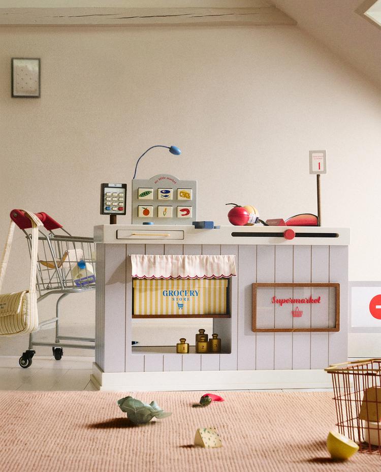 Includes a magnetic checkout belt, a barcode scanner with sound, a button-activated opening drawer, a 'next customer' sign, swing doors with a no-entry symbol and a top sign displaying the supermarket's name.
