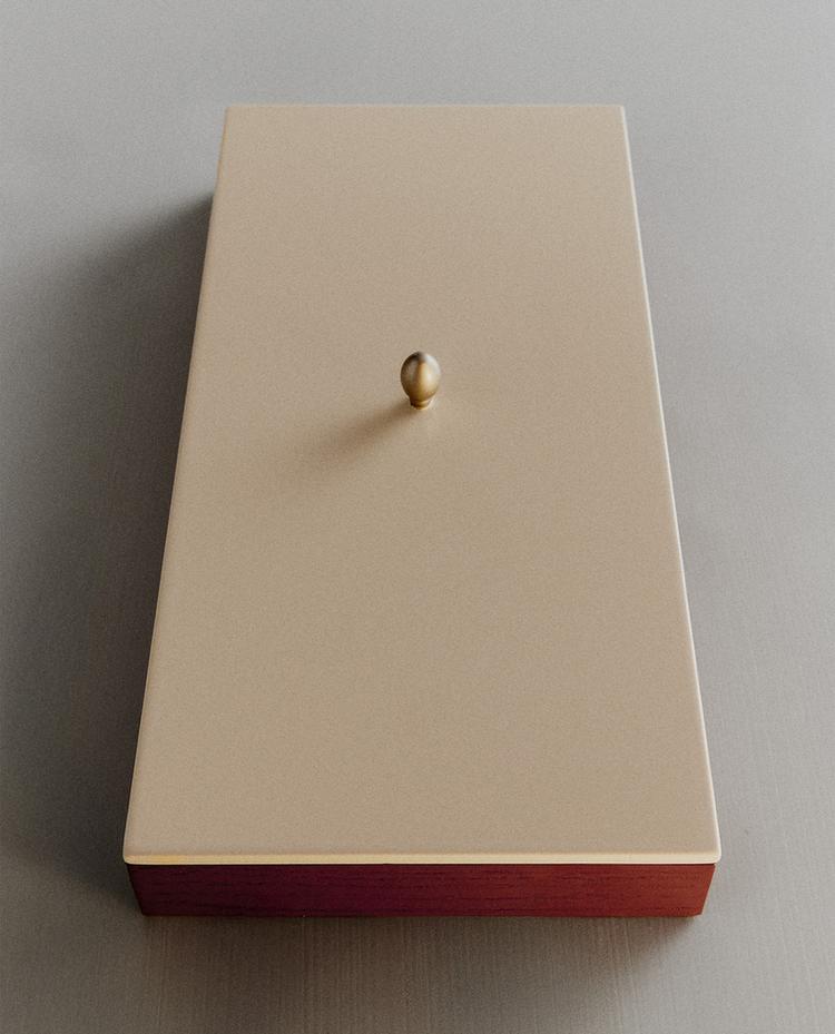 Box with lid made of ash wood with a lacquered finish. Rectangular shape with contrast coloured interior and exterior. Plain surface with uniform colour applied in several layers. Lid fitted at top.