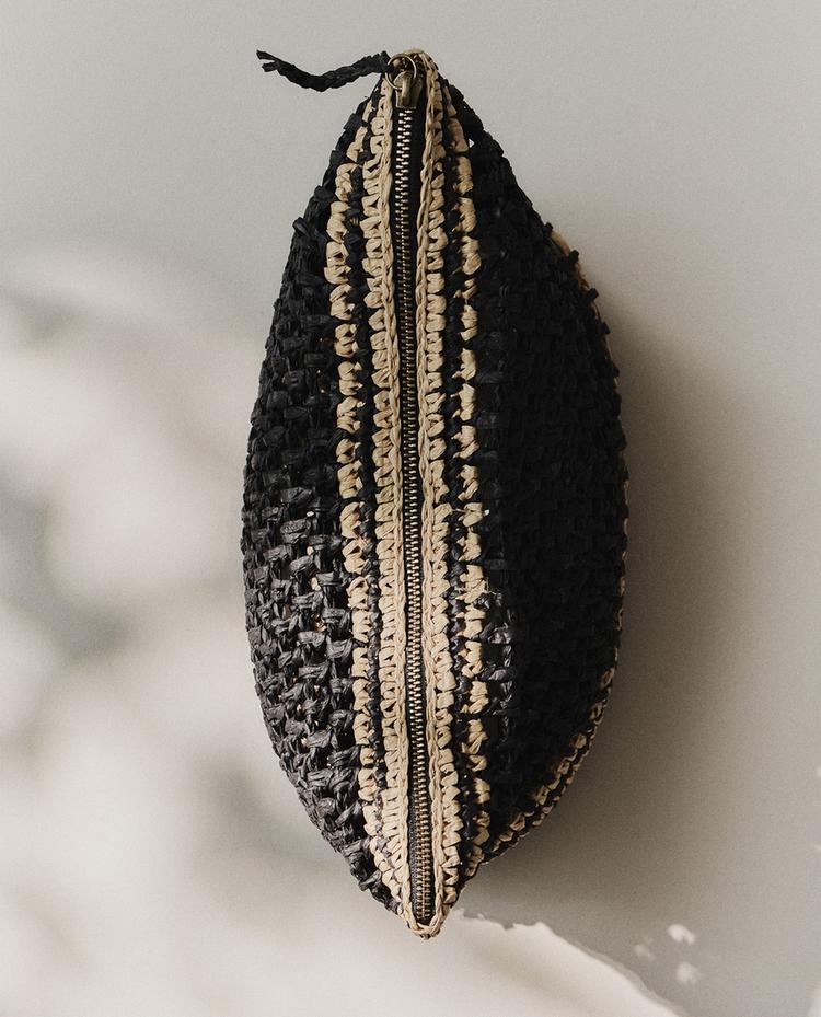Woven paper clutch-style bag. Zip closure. Complete your look with the matching tote bag.